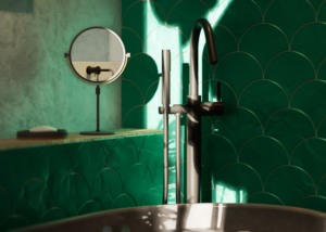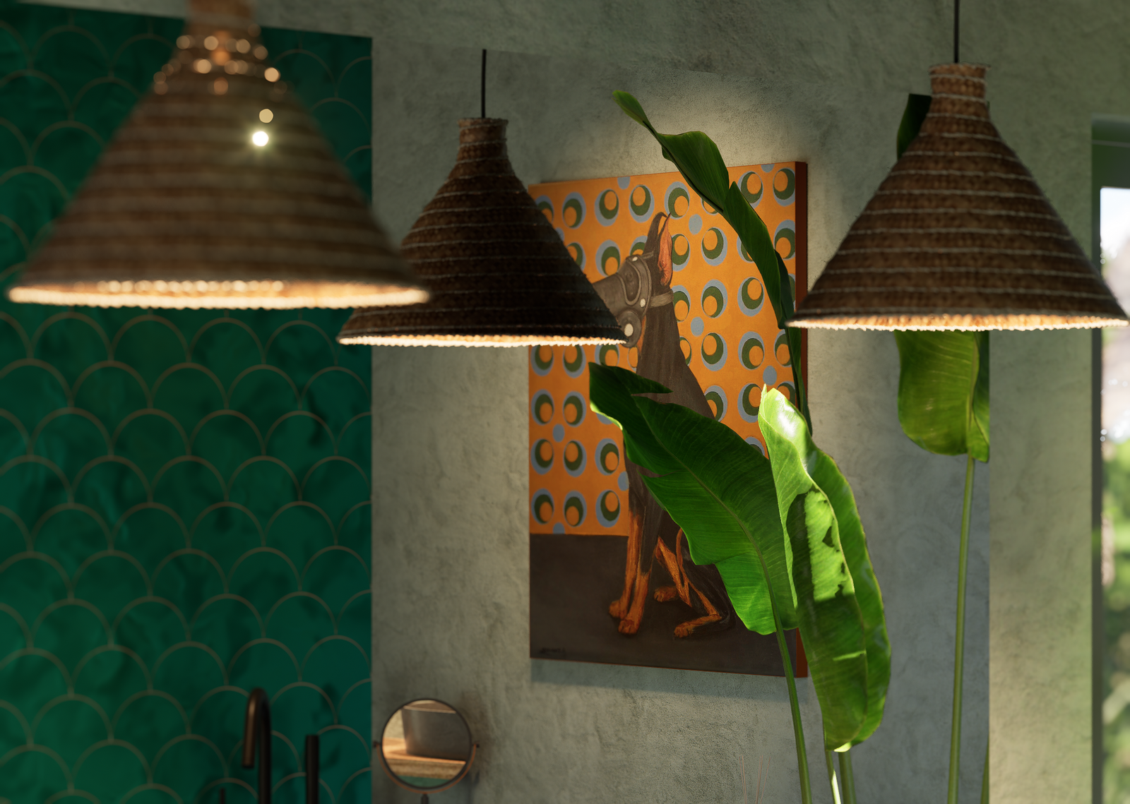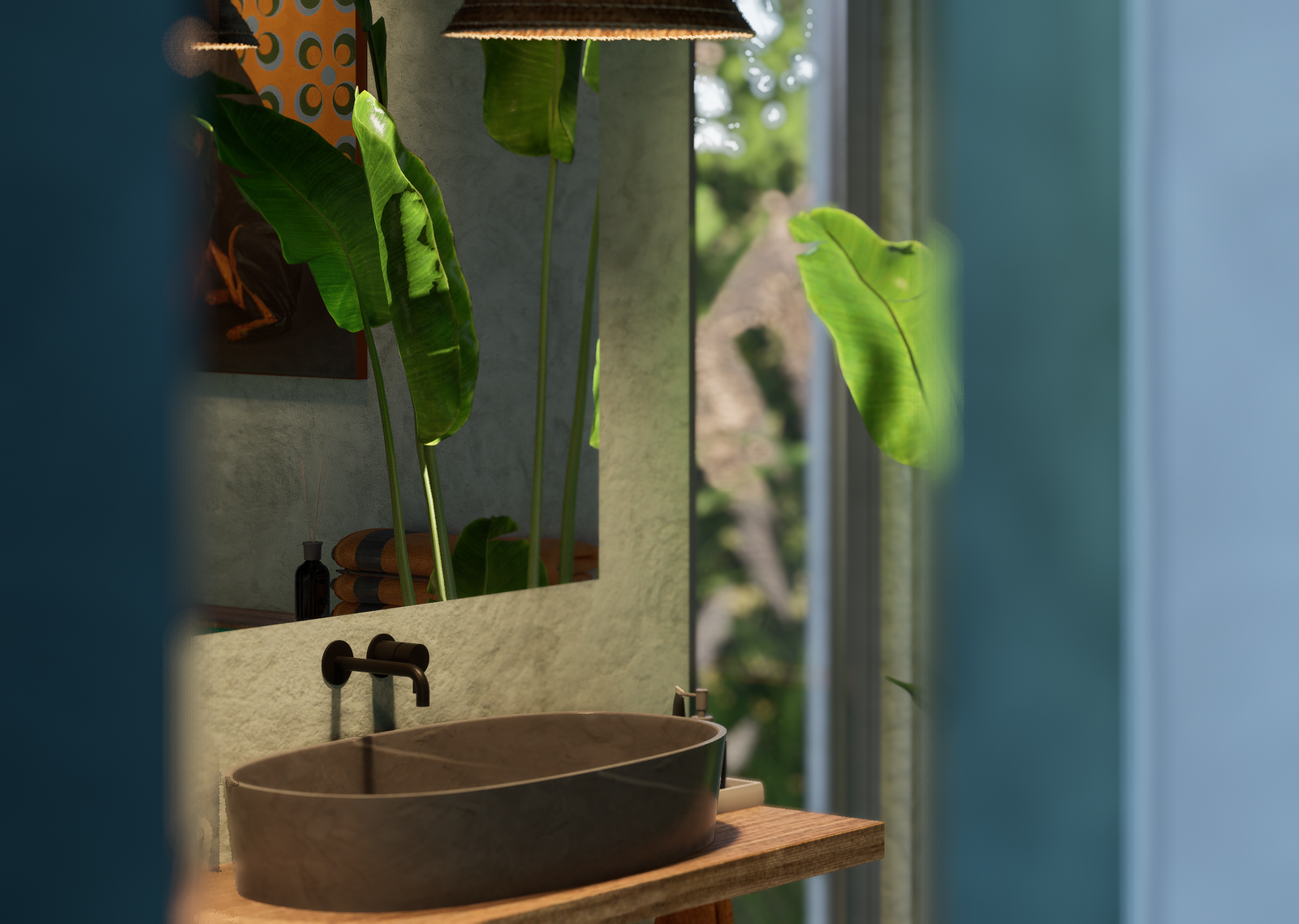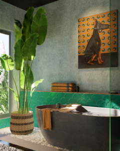 Oasis de Materia y Luz. Una propuesta donde la arquitectura interior se rinde a la naturaleza. A través de una selección de materiales que van desde la piedra esculpida hasta la cerámica tradicional, este espacio busca disolver el límite entre el interior y el exterior. Un diseño biofílico que utiliza el color y la textura como herramientas para ‘esculpir’ una atmósfera de retiro tropical dentro de un marco de modernidad urbana.